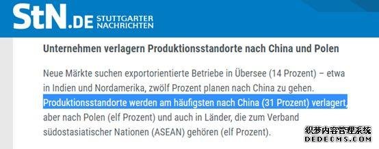 但即便如此,德國企業(yè)還是會(huì )繼續推進(jìn)國際化的發(fā)展,而中國則不僅是受青睞的國際市場(chǎng)之一,更是最受歡迎的海外生產(chǎn)基地。根據德國《斯圖加特新聞報》的報道,德國商業(yè)銀行的調查還發(fā)現,31%的德國中小企業(yè)準備把生產(chǎn)基地轉移到中國。