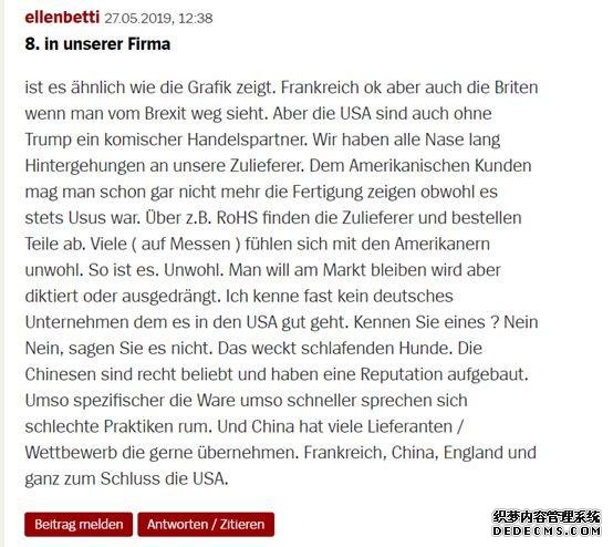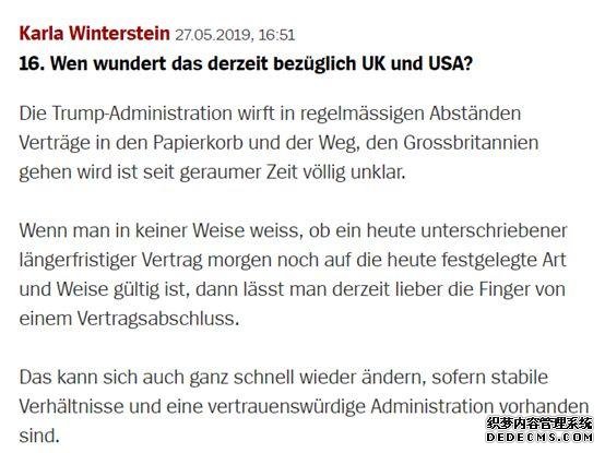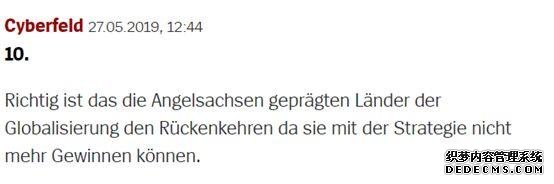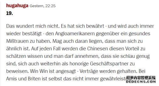 其他網(wǎng)民也多數認為,美國和英國對于“共贏(yíng)”理念的遺棄,是導致這兩個(gè)西方世界的大國越發(fā)不受到德國企業(yè)信賴(lài)的原因。
