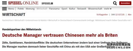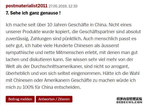 最后,在德國《明鏡》周刊的論壇上,許多留言者也對這一調查結果表示認同。一位稱(chēng)自己在中國從商10年的網(wǎng)民就留言說(shuō),中國人對于世界的認知比美國人要好,也不像美國人那么傲慢和自我,確實(shí)是可靠的貿易伙伴。另一位網(wǎng)民則表示比起中國來(lái)說(shuō),美國確實(shí)對德國企業(yè)來(lái)說(shuō)不太靠譜,總讓德國企業(yè)感到不舒服。